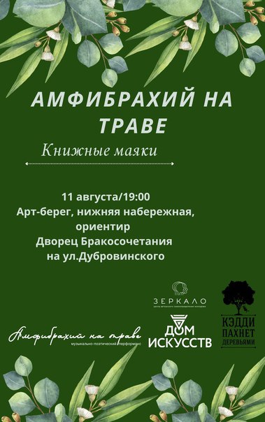 11 августа в 19.00 на Арт-берегу пройдёт «Амфибрахий на траве». Всё, что вы любите: красивые люди, стихи, огоньки.