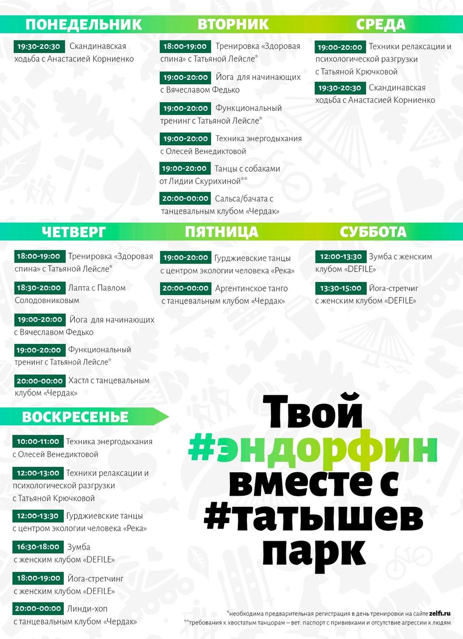 Каждый день (кроме понедельника) на острове Татышев проходят бесплатные тренировки: йога, зумба, сальса, стретчинг и многое другое. Держите подробную афишу на неделю. Проводятся в разных локациях острова, здесь ссылка на карту. Не забудьте сохранить в избранное и поделиться с друзьями.