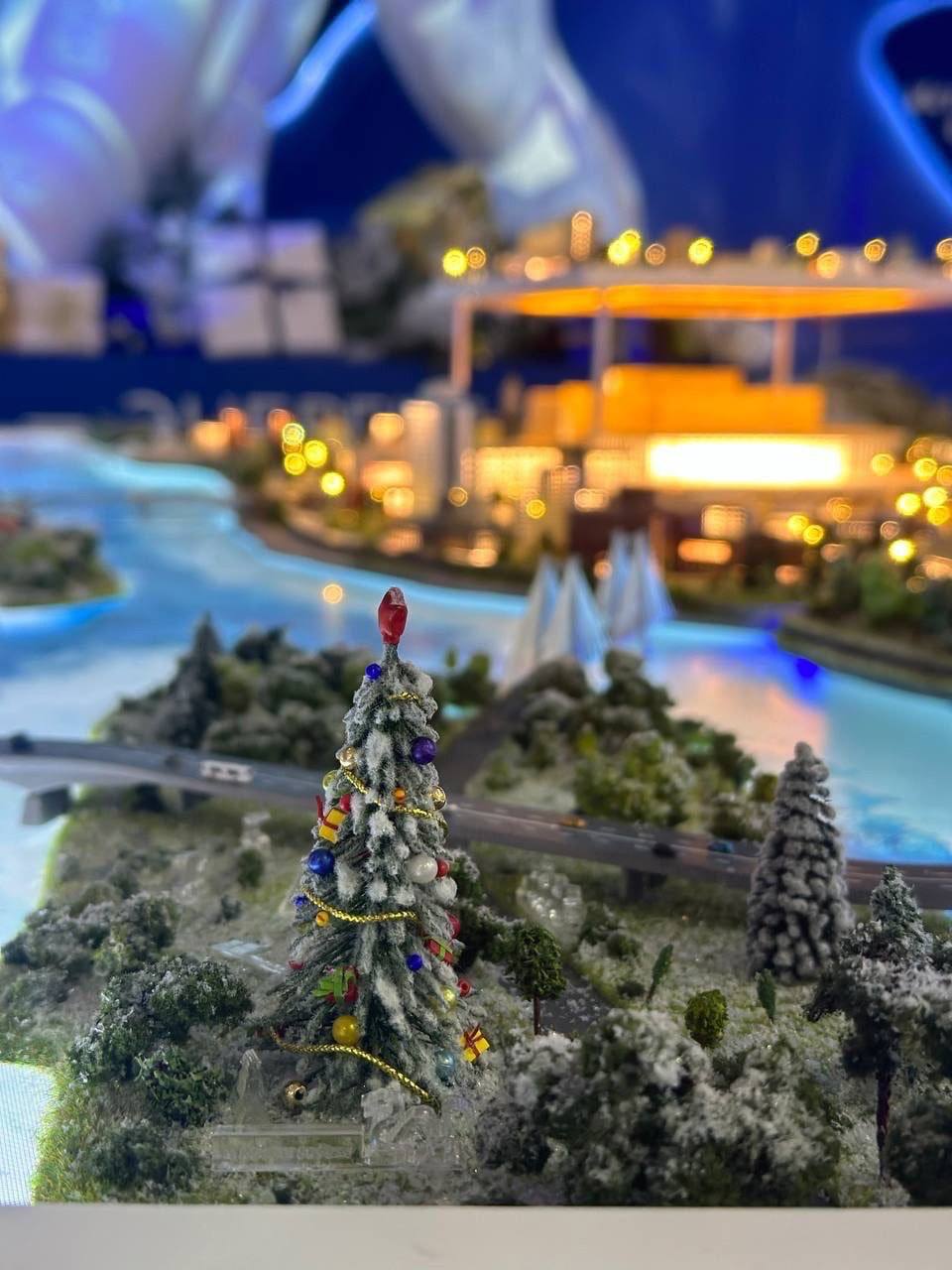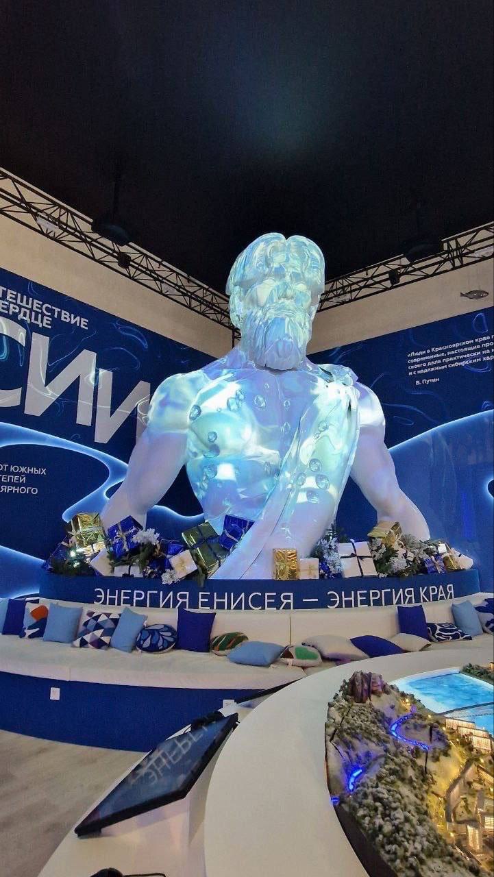 На стенде нашего края появились множество украшенных ёлок, а сам макет получил обновление - на нем теперь изображены ёлки, снег и даже льдины на Енисее.