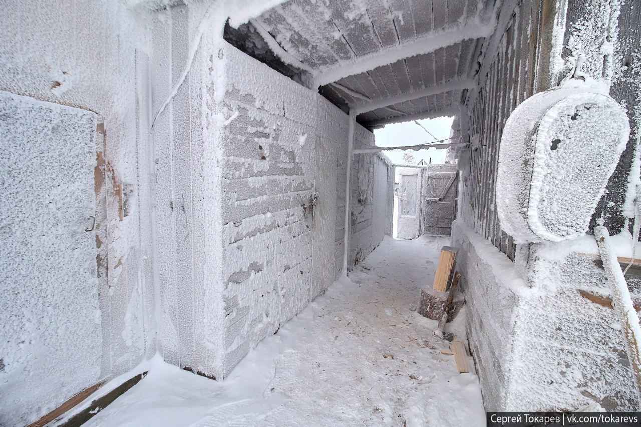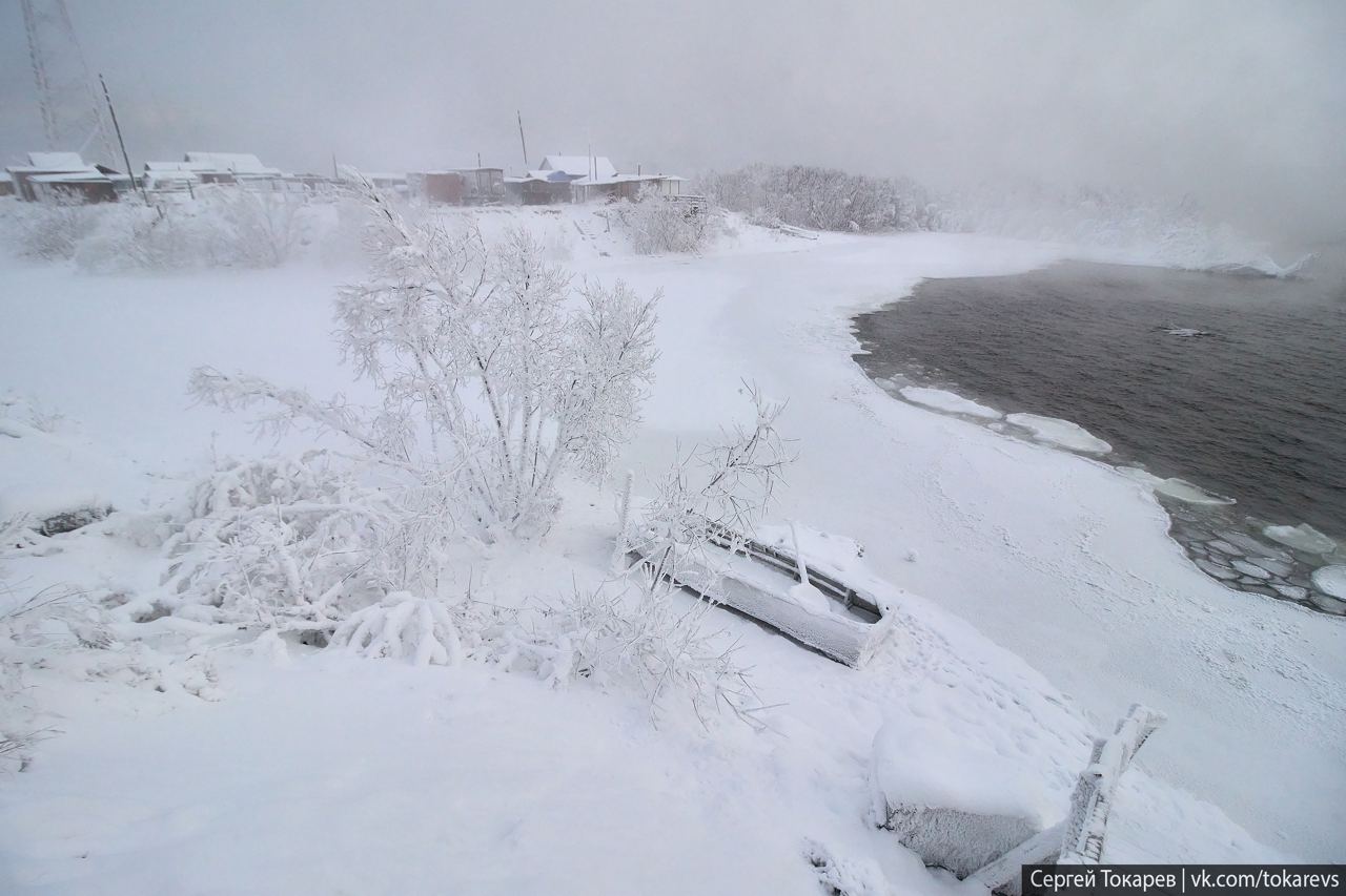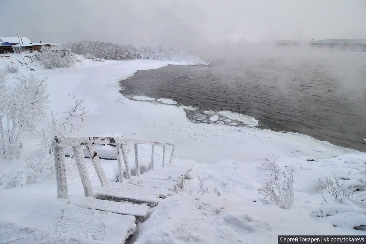 Находится деревня в нижнем бьефе плотины. Ангара здесь не замерзает и парит всю зиму. На фото всего -23, но все равно инея хватает. В -35-40 через наледь досок не видать вообще. Дико красивое место.