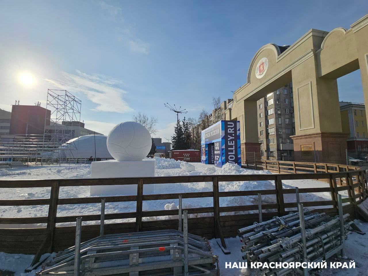 В центре Красноярска на Площади Мира сделали огромный снежный мяч