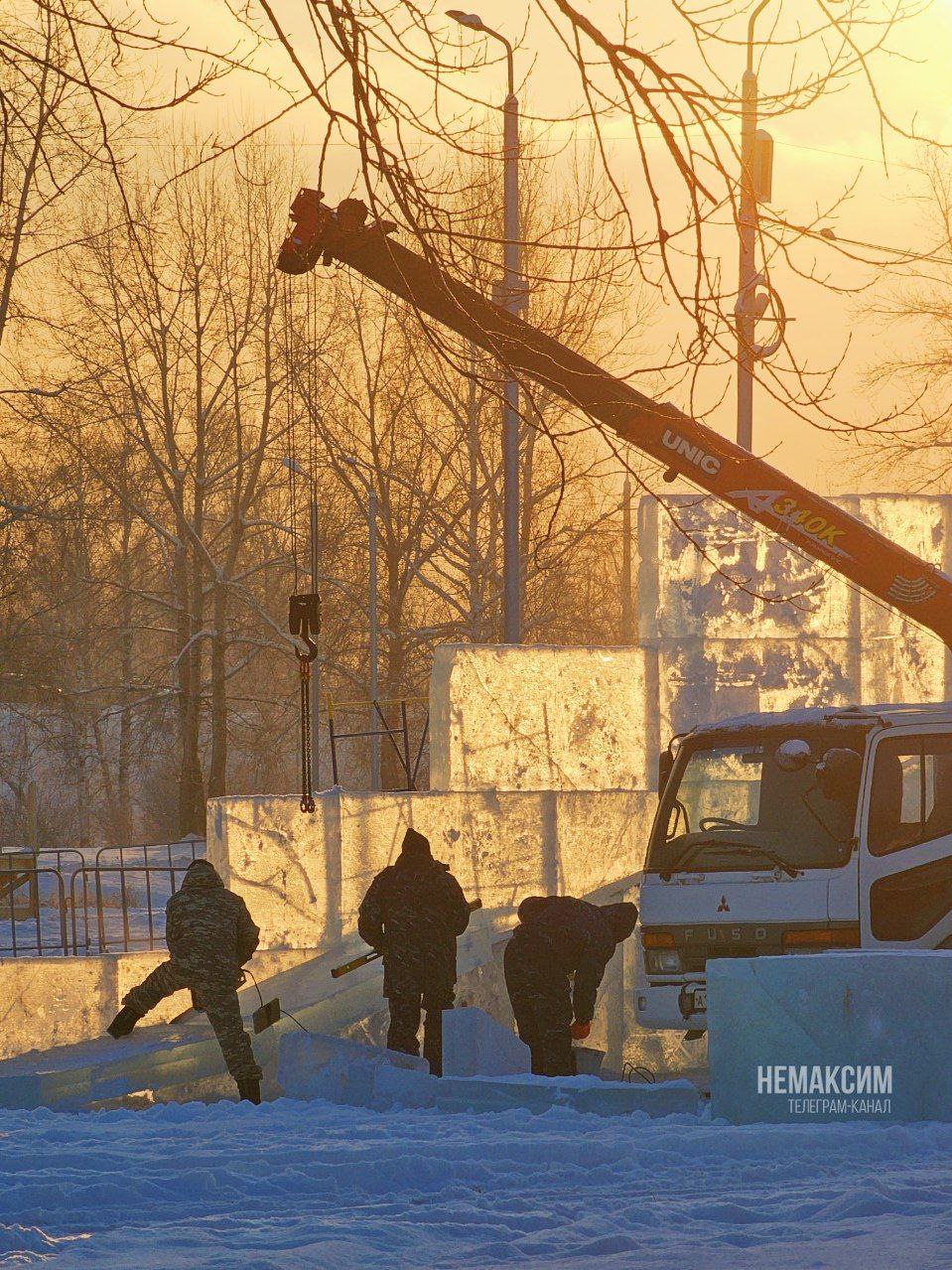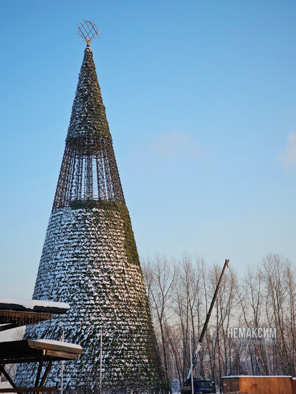 Главную ёлку Красноярска в Татышев-парке продолжают оформлять. Точнее — пока только устанавливают все элементы, украшательства — позже. Ледовый городок тоже уже заливают. Где-то ещё только установили лестницы для горок, но местами уже есть приличные такие скаты. Поймать удалось главное украшение — солнечные лучи через пустые секции огромной ёлки.