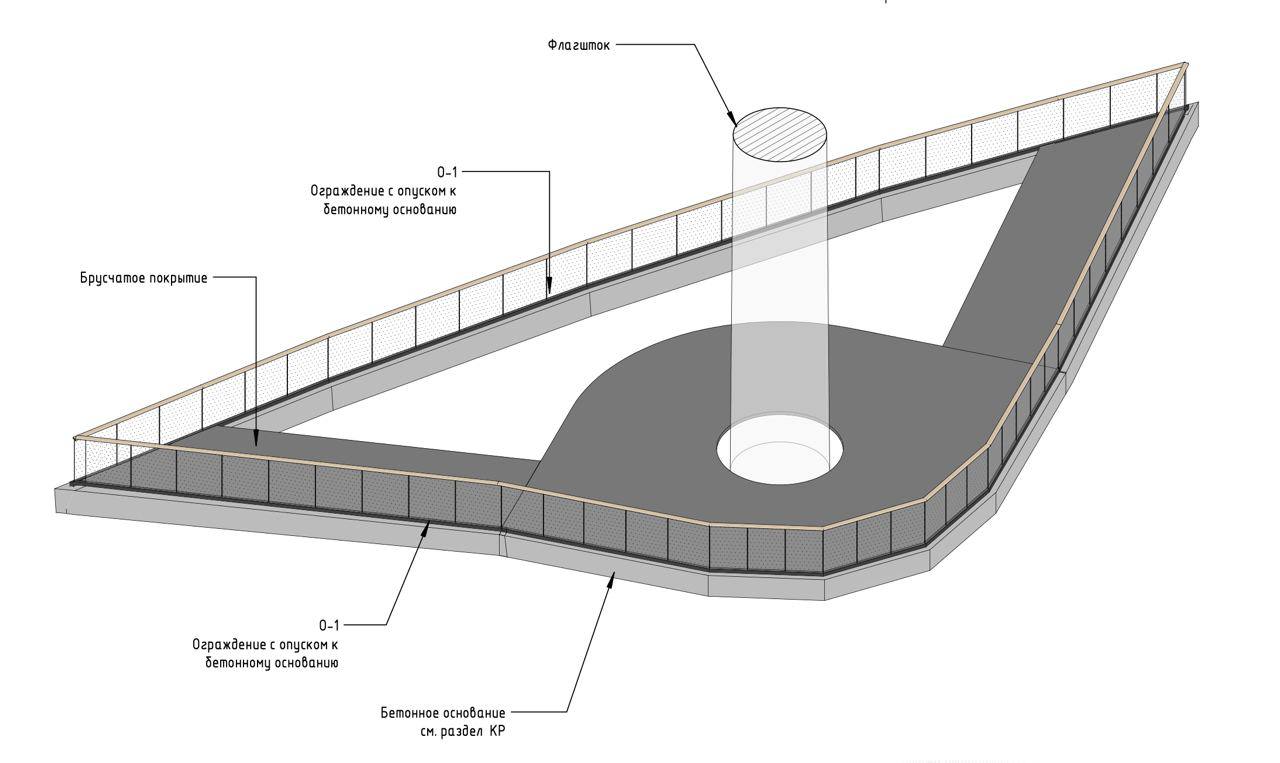 В соответствии с документацией для торгов, там будет создана площадка вокруг флагштока с водоотводом, кустарниками, газоном и информационным стендом.