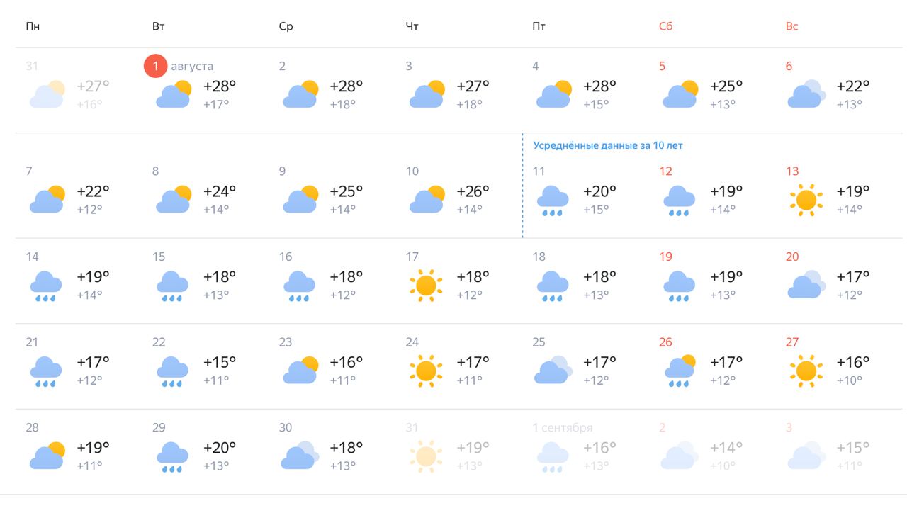 С 11 августа «Яндекс. Погода» делает прогноз на усредненных данных за 10 лет.